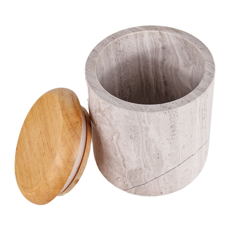6. Grundlegende Beschreibung: Der Marmor mit grauer Holzmaserung hat eine seltene Farbe und ist einzigartig. Jeder Behälter ist ein Unikat mit seiner unverwechselbaren Maserung. Der Behälter wird im Ganzen geformt. Verbundmaterial, Marmorsockel mit Holzdeckel. Das Deckelmaterial kann beliebig sein, z. B. Marmor, Holz, Metall usw. Individuelle Logos sind willkommen.