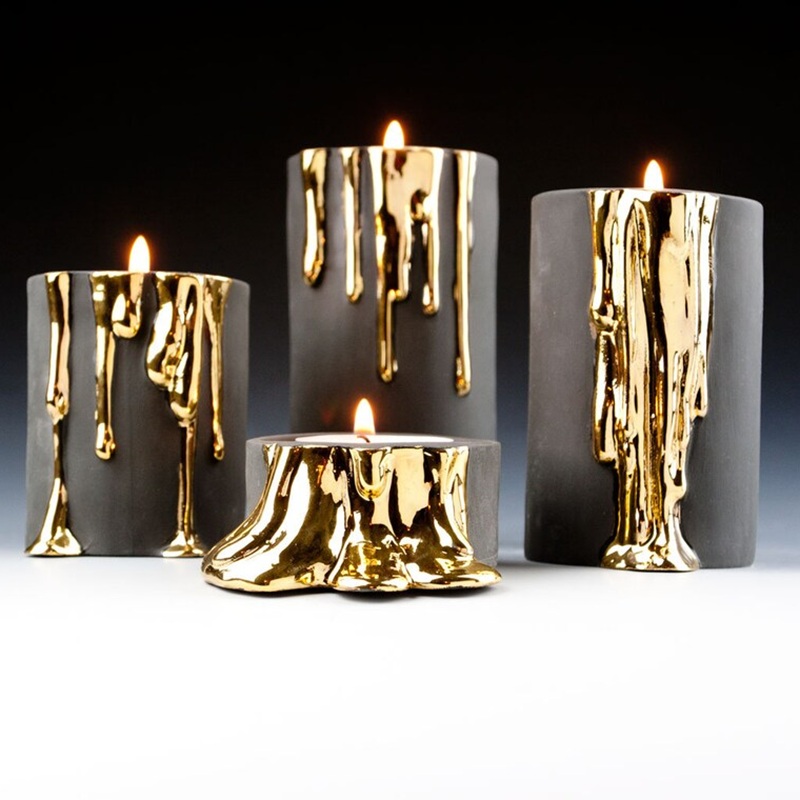 The items are decorated with naturally looking melting drops plated with gold. The contrast between dark matte surface and glossy gold drips is a fantastic combination.
