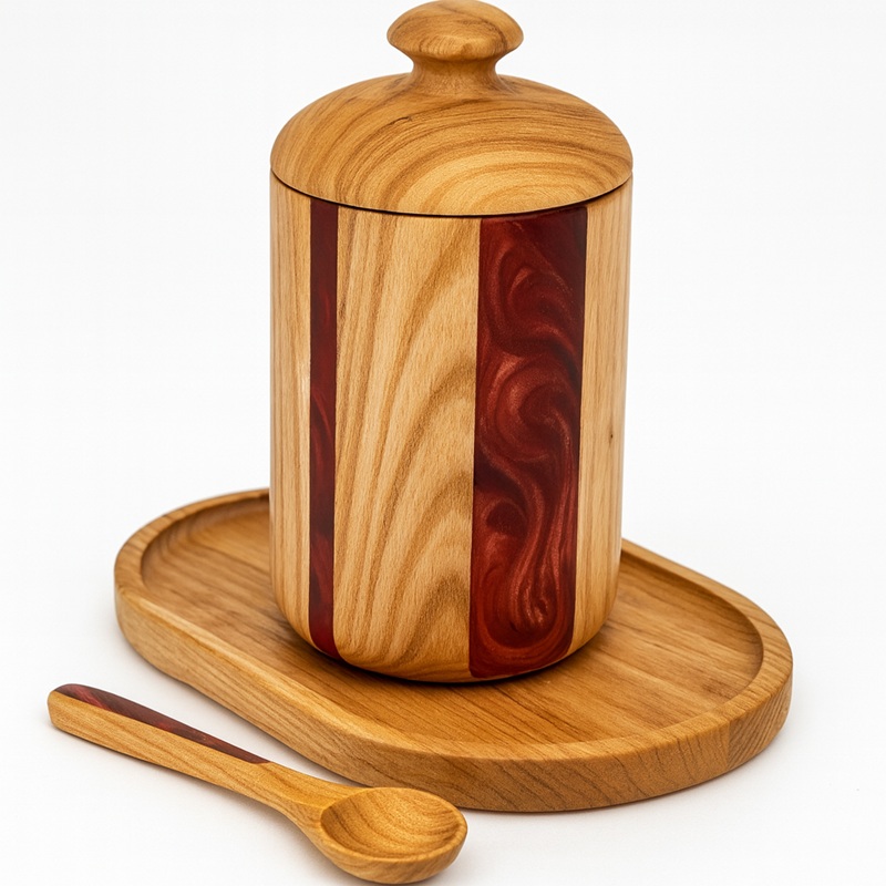 • Cohesive set: Tray & spoon mirror the jar’s wood-resin design for a unified look