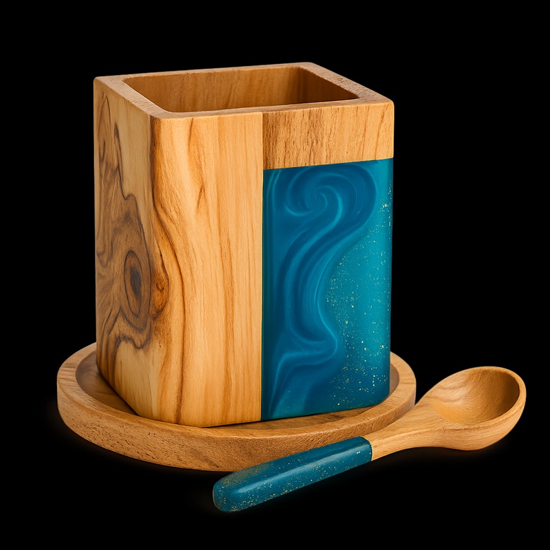 A handcrafted collection blending natural solid wood with swirled epoxy resin—available in multiple colorways (turquoise, gray, frosted, burgundy, amber). This versatile set combines rustic warmth with modern flair, perfect for kitchen storage, desk organization, or decorative display.
